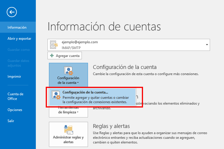Si tienes tu cuenta de correo configurada en Outlook, y necesitas modificar la configuración de la cuenta te explicamos como acceder a la configuración de Outlook y cambiar los diferentes parámetros de tu cuenta de correo en unos sencillos pasos: