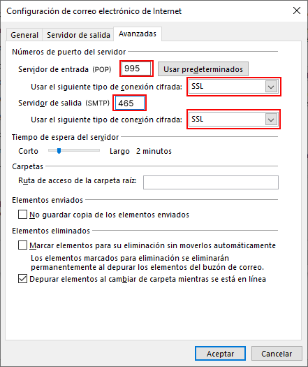 En la sección Avanzadas, podemos comprobar los puertos que se están empleando así como el tipo de conexión que se emplea (TLS o SSL).