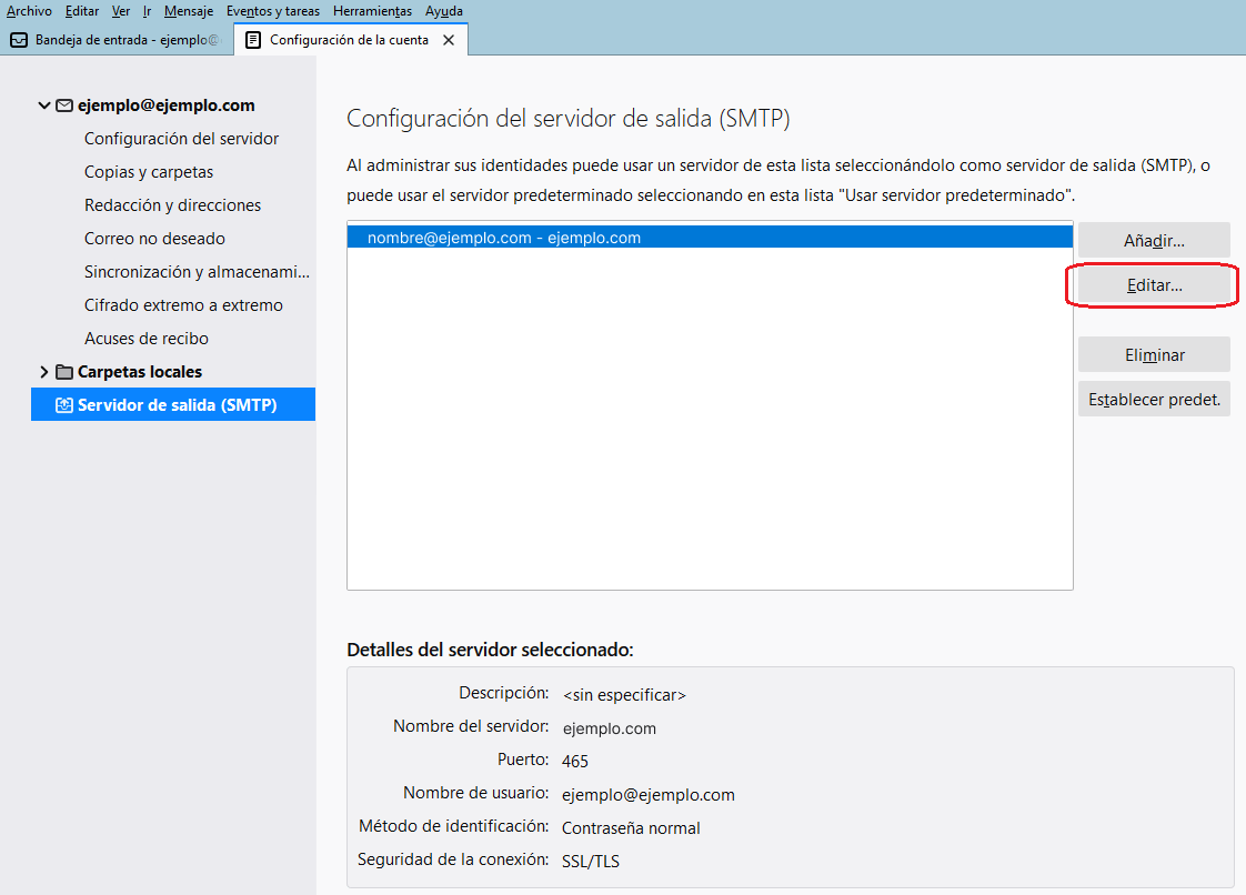 En la sección Servidor de salida (SMTP), selecciona el servidor que estás utilizando y pulsa sobre Editar para ver su configuración:
