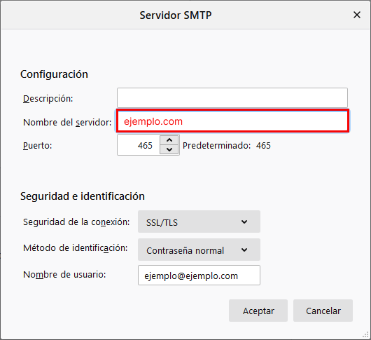 Aquí puedes cambiar el nombre de servidor de salida, el puerto de salida que se utiliza y el tipo de conexión, además del nombre de usuario que se usa en la autenticación del servidor de salida: