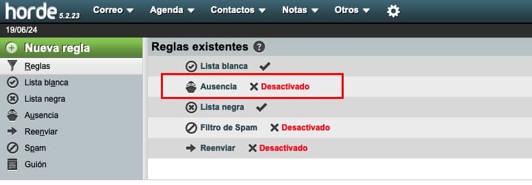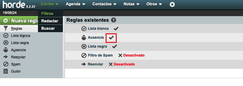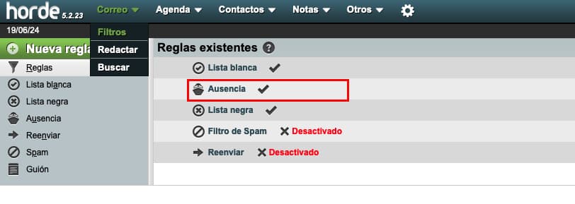 - Para comprobar que la autorespuesta esta activada pulsa el botón de correo de la parte superior y haz clic en filtros y la opción de Ausencia debe aparecer con un check