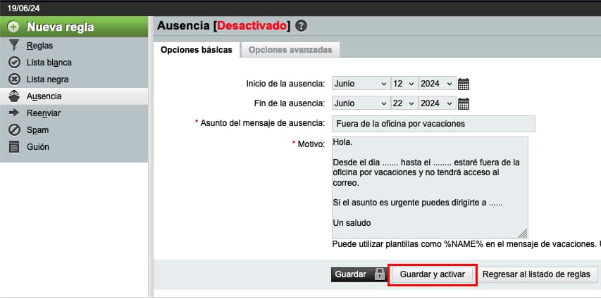 - Si has seguido todos los pasos anteriores la auto-respuesta debe estar activada y en la parte superior ha debido desaparecer la opción de [desactivado]