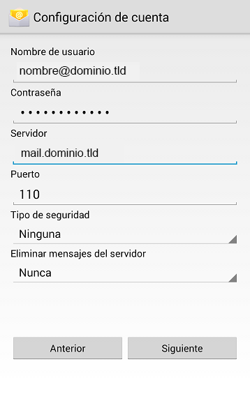- Introducimos la siguiente configuración para el servidor de correo entrante, teniendo en cuenta que el servidor de correo será ‘mail.sudominio.com’.