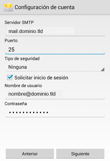 - Introducimos la siguiente configuración para el servidor de salida de correo, teniendo en cuenta que el servidor de correo será ‘mail.sudominio.com’.