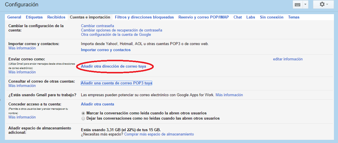 3. En el apartado “Consultar el correo de otras cuentas” pinchamos en “Añadir una cuenta de correo POP3 tuya”