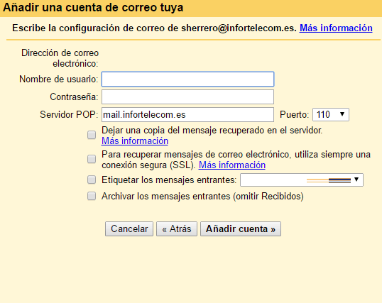 Al pulsar en “Añadir cuenta” Gmail empezará a descargar todos los mensajes que tengas en el buzón de tu correo eliminándolos del servidor de Infortelecom. Esto es especialmente útil para gente que recibe gran cantidad de correo y satura su buzón. Si configuras Gmail de este modo no tendrás problemas ya que el espacio será ocupado en Gmail y no en tu cuenta del servidor. También es muy útil para gente que quiera tener una aplicación centralizada desde la cual leer los correos.