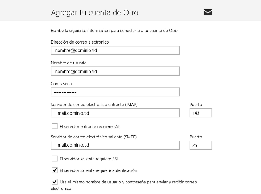 - Servidor de correo saliente (SMTP): mail.ejemplo.com. Puerto 25.