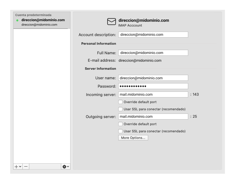 Sustituya los datos convenientemente: donde ponga «midominio.com» debe poner su nombre de dominio y «direccion@midominio.com» por la direccion de su cuenta de correo